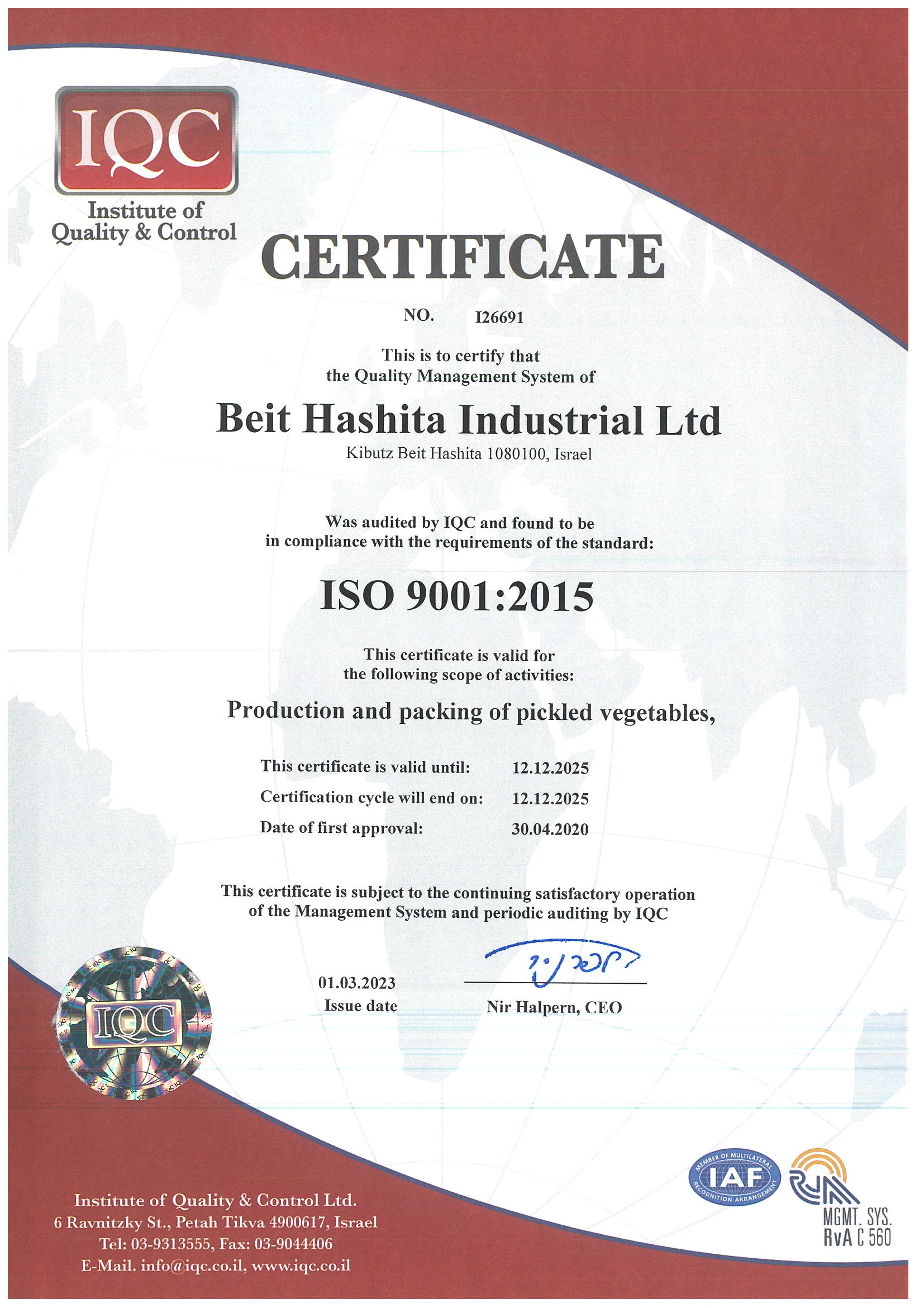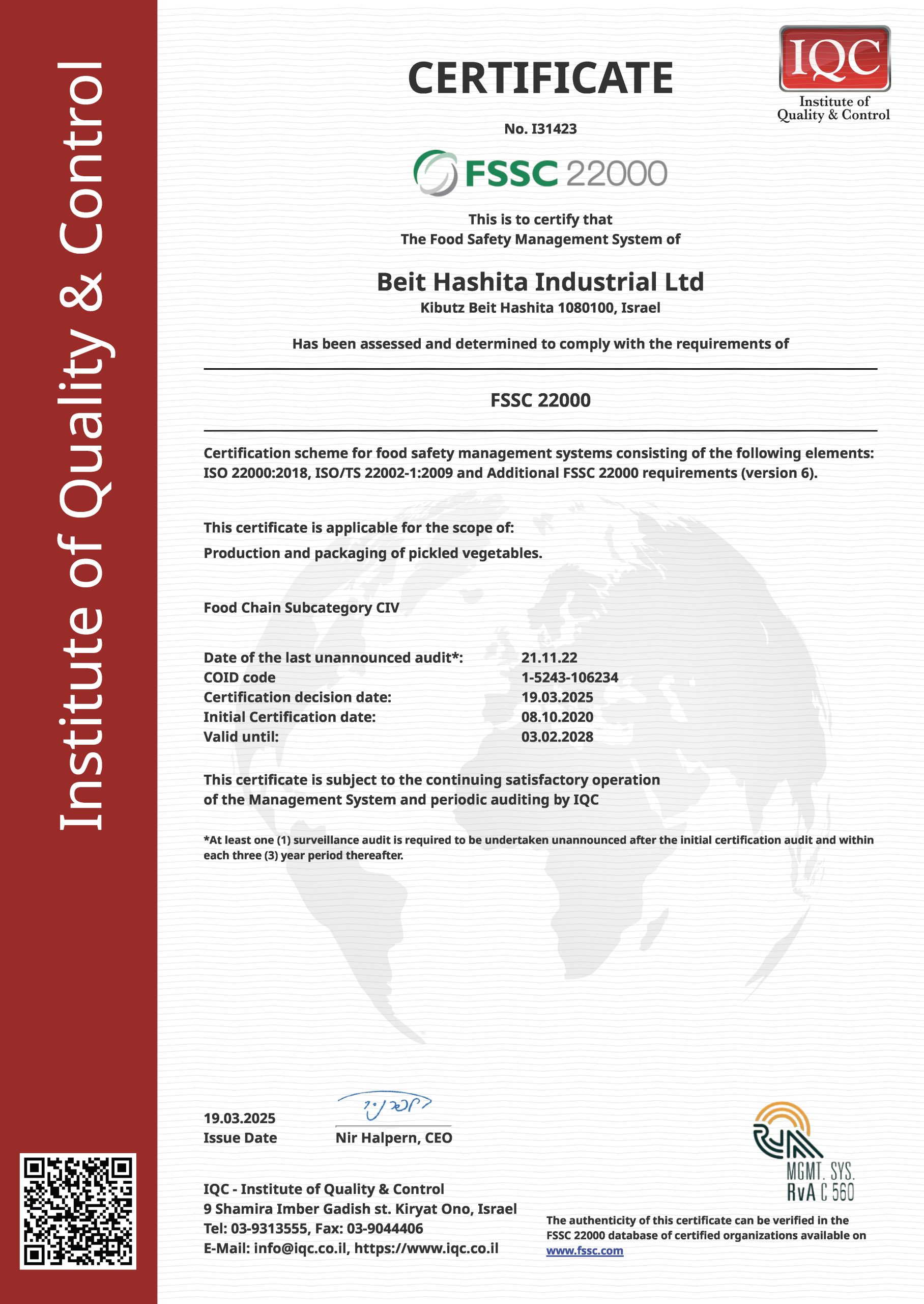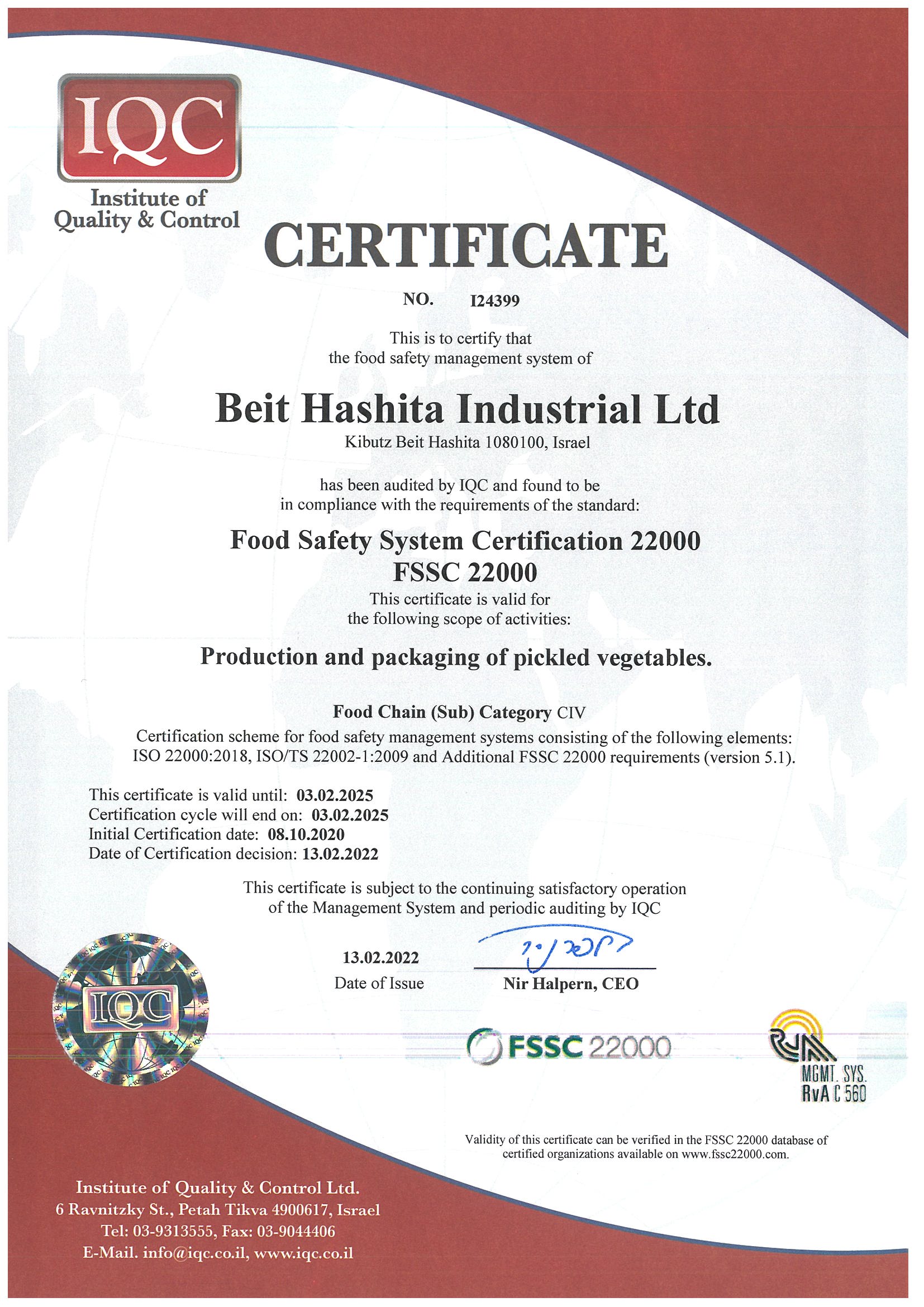 מדיניות האיכות של החברה הינה לפתח, לייצר ולשווק מוצרים בטוחים, המתאימים לתקנים לאומיים, לחוקים ולמפרטים העונים לדרישות ולשביעות רצונם המלאה של הלקוחות, תוך עמידה מלאה בחוקים ובתקנות הנוגעים לבטיחות המזון. ומתחייבת לעמוד בכל הדרישות הנגזרות מהחוקים, התקנות והצווים וכל דרישה חוקית הרלוונטית לפעילות החברה.
